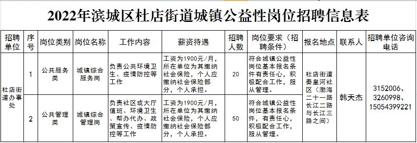 (一)薪酬待遇:補貼標準按照不低于當?shù)卦伦畹凸べY標準確定,社會保險補貼標準參照用人單位為上崗人員實際繳納的社會保險費執(zhí)行(不包含個人應(yīng)繳納部分)。詳見《2022年濱城區(qū)杜店街道城鎮(zhèn)公益性崗位招聘信息表》。